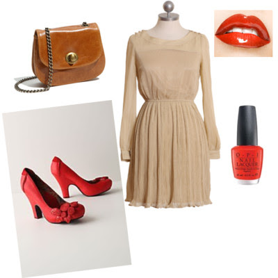 | This simple look gets a pop of color with red shoes plus red lips and nails |